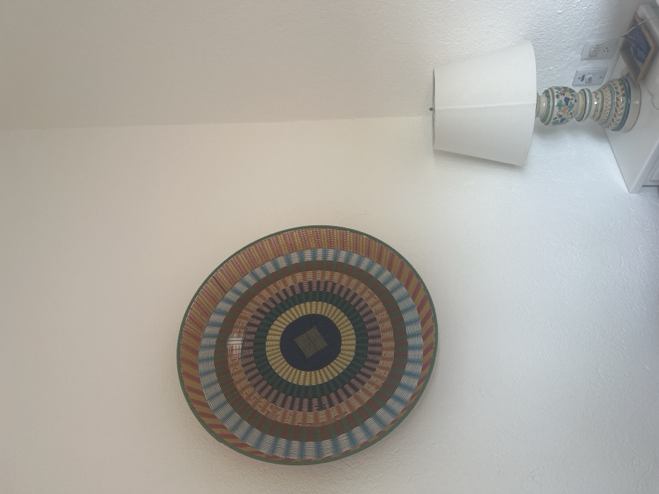 A woven, circular piece of art hangs on a white wall. It features concentric rings of colors, including brown, blue, green, and yellow, emanating from a dark blue square at the center. Above it and to the right, a table lamp is mounted on the wall, with a white lampshade and a decorative ceramic base in shades of white, green, blue and brown. The background is a plain white wall.