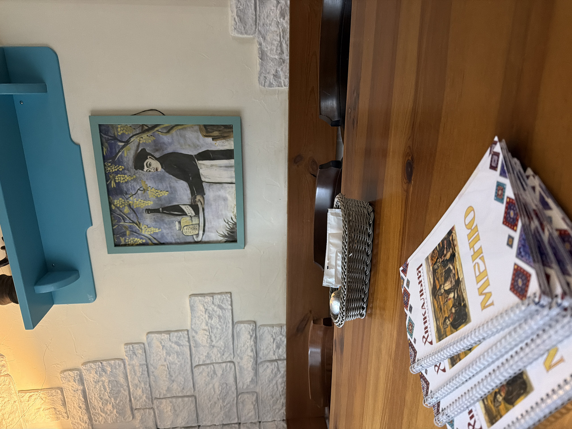 The image depicts the interior of a Khinkalnya restaurant in Dnipro, Ukraine. The primary subject is a prepared dining area, viewed from a slightly elevated perspective. In the foreground, a polished, light brown wooden table extends across the lower half of the frame. On the left side of the table, a stack of approximately five spiral-bound menus is neatly arranged. The visible top menu cover features the words "ХІНКАЛЬНЯ" (Khinkalnya) and "МЕНЮ" (Menu) in prominent gold lettering, accompanied by an illustration of people dining at a table and a decorative geometric pattern along the bottom. To the right, centered on the table, a small grey woven basket holds several individually wrapped white sugar packets and a small, reflective, metallic item. Behind the table, dark brown wooden booth seating or a continuous bench runs along the wall. The wall itself is off-white, with a section of decorative white faux-stone cladding in irregular blocks visible on the left. Mounted on the wall above the seating is a light blue wooden shelf. Below the shelf and to the right, a rectangular painting is displayed in a matching light blue frame. The artwork portrays a figure in a black outfit and white apron, holding a tray that contains a dark bottle and a yellow, rectangular object, possibly cheese. Above the figure, yellow grape clusters hang from green vines. A thin black cable protrudes from behind the upper right corner of the painting and extends upwards. The scene is illuminated by warm, artificial light originating from the upper left, creating subtle shadows. No individuals are present in the frame.