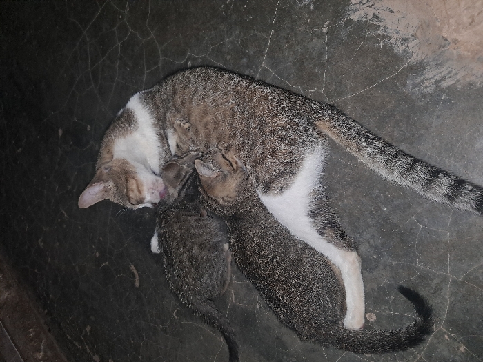 A tabby cat with a white patch on its neck and a long striped tail is lying down on a gray, cracked surface. Two kittens are huddled close to the mother cat, seemingly nursing. The cat's face is turned towards the kittens, showing a pink tongue. The lighting appears to be dim, creating shadows around the subjects. The scene depicts a tender moment of maternal care.