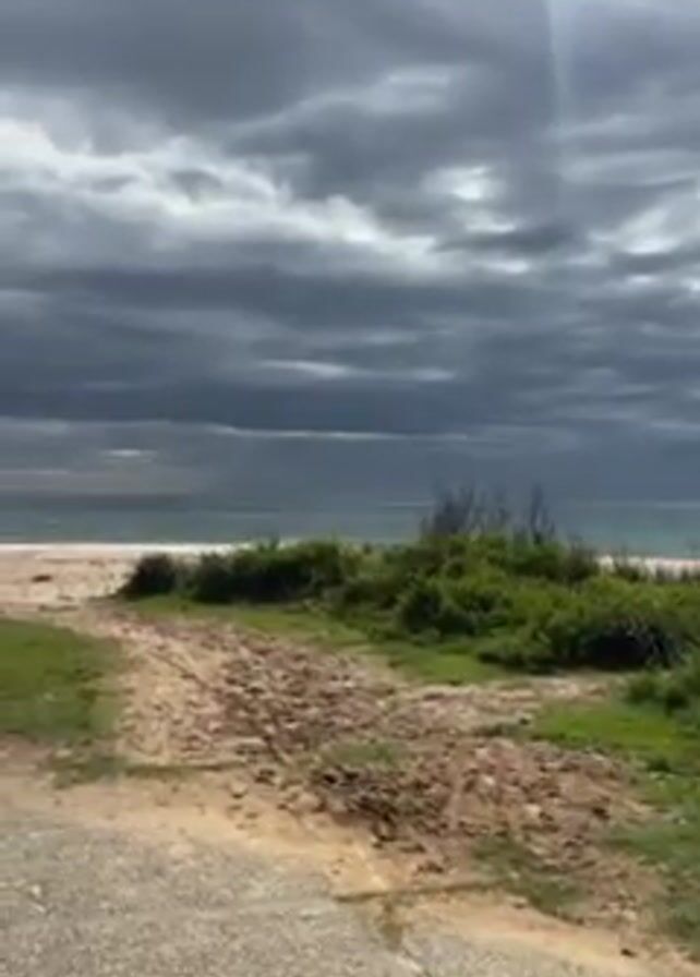 view of a beach under a cloudy, grey sky. A dirt path leads toward the beach, with green grass and small bushes on either side. The ocean is visible in the distance, with gentle waves breaking. The sunlight peeks through the clouds.
