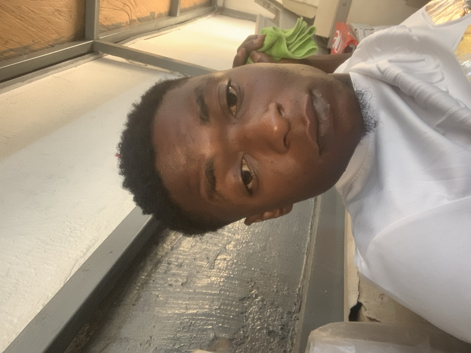 A young adult male of African descent is shown in a close-up, head-and-shoulders portrait. He has short, dark, curly hair with a fade and a small goatee. His dark eyes gaze directly forward. He is wearing a white, collared garment. His right hand grasps a crumpled light green microfiber cloth, positioned beside his head. The background reveals a functional, possibly commercial or semi-industrial setting. On the left, a dark gray horizontal beam spans above a light-colored wall featuring irregular texture and visible surface cracks. A translucent white plastic covering is partially visible in the lower left. On the right, a dark gray metallic framework supports an overhead structure composed of lighter-toned, possibly wooden or corrugated material. Red and white packaged items are discernible in the lower right corner. The location is an indoor or sheltered outdoor urban space, consistent with a market stall, small business premises, or a workshop environment often found in cities such as Abuja, Nigeria. Specific street-level identification within Abuja is not ascertainable from the visual evidence.