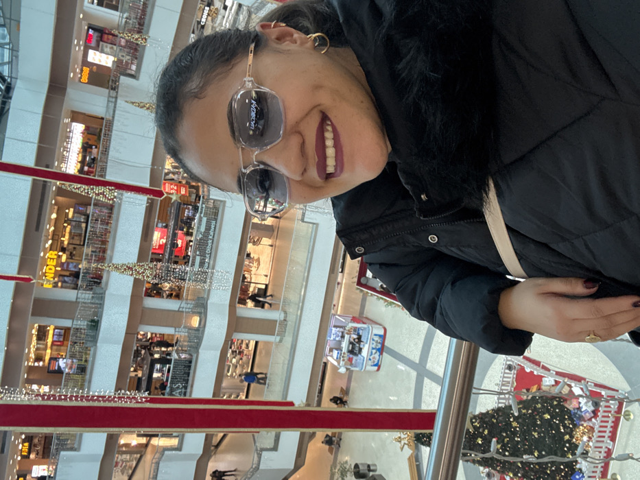 A smiling woman with sunglasses and dark lipstick stands near a railing in a multi-level shopping mall. The mall has several floors visible, with shops and restaurants. Christmas decorations, including garlands and a large Christmas tree, are present. People can be seen walking on the different levels. The woman wears a black puffer jacket with fur trim.