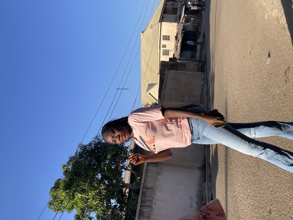The image portrays an outdoor urban street scene located in Jos, Nigeria, under a clear blue sky with bright sunlight. A dark-skinned female, appearing to be a young adult, stands slightly right of center, facing the camera. She has long, dark braided hair and is wearing a light pink short-sleeved t-shirt with a graphic design, paired with light blue flared jeans. Her right hand is raised with fingers loosely curled, while her left hand grips a dark-colored smartphone. To the left of the main subject, a partial view of another individual, wearing a light-colored garment with a floral pattern, is visible at the extreme left edge of the frame. A low, light-colored concrete wall lines the left side of the paved street, behind which a large, verdant tree is prominent. The street surface is light brown and shows minor debris, including a white plastic wrapper in the mid-right foreground. In the background on the right, a two-story building with a light-colored facade and a tan-colored hip roof is visible, featuring multiple windows on its upper floor. Below this structure, a series of commercial stalls with corrugated metal roofs are present. Several indistinct figures are observed in the background on the right side of the street near these stalls, one of whom is distinctly wearing a light blue shirt. Overhead utility lines are visible against the clear sky in the mid-right portion of the frame.