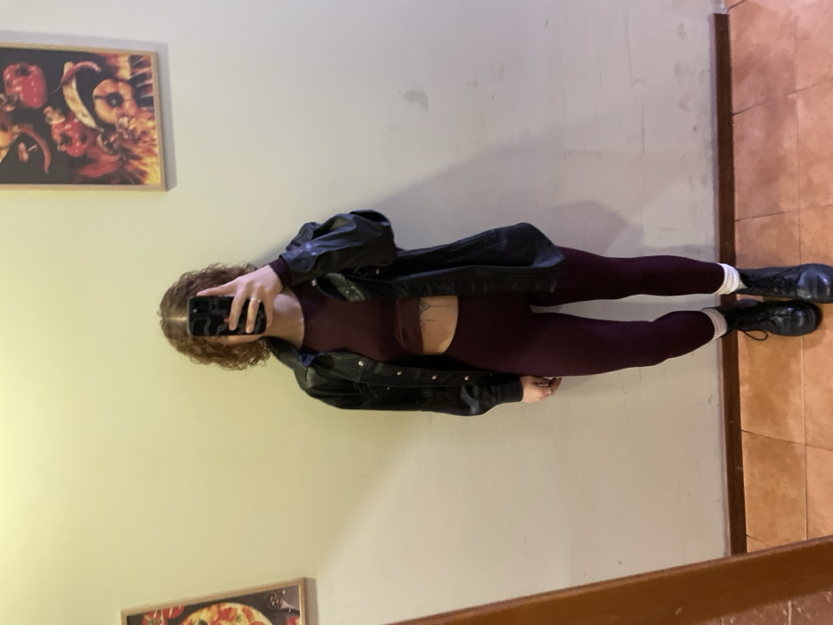 An individual is depicted taking a mirror selfie indoors, in what appears to be a restaurant or eatery located in Bar, Montenegro. The person's face is obscured by a black smartphone held in their right hand. They have shoulder-length, curly, reddish-brown hair. Attire consists of a dark maroon long-sleeved crop top, an open black oversized leather-like button-up shirt, dark maroon leggings, white socks, and black lace-up combat boots. A fine-line tattoo is visible on the abdomen. The environment features light beige/cream colored walls and a brownish-orange tiled floor. Wall decor includes two framed pictures: one of a pizza partially visible on the left, and another of grilled peppers with flames on the right. The image captures a static moment of self-photography within a casual dining setting.