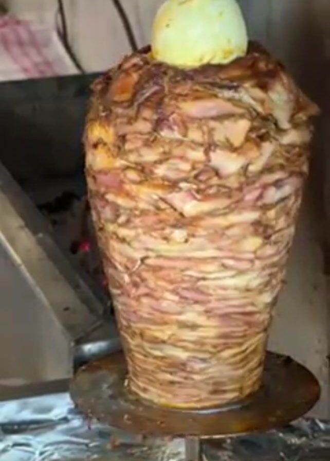 - "large cone of thinly sliced meat rotating on a vertical spit" by FM-RjPGA3, licensed under CC BY 4.0