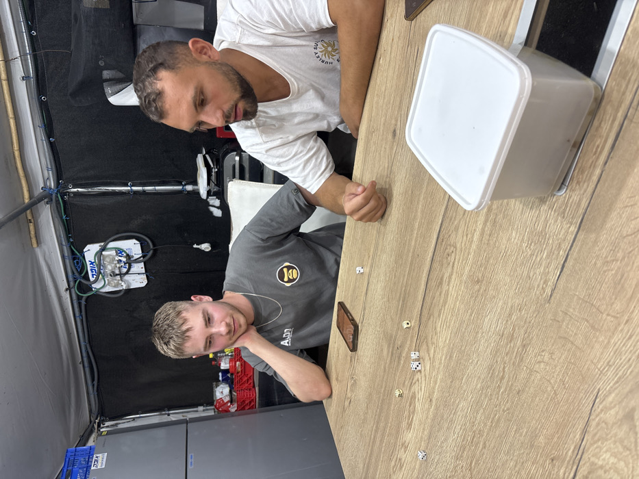 The image portrays two males seated at a light-colored wooden-grain table in an indoor setting in Mazkeret Batya, Israel. Six white dice are scattered across the table surface. The male on the left, with short light-brown hair, wears a grey t-shirt displaying a BAPE ape logo and "A.D.J." text, along with a silver chain. He is seated, resting his left elbow on the table and supporting his chin with his left hand, looking down at the dice. A brown smartphone lies face down near his position on the table. The male on the right, with short dark hair and stubble, wears a white t-shirt featuring a partially visible "Hurley Surf" logo. He is seated, leaning forward, with his right hand visible on the table near a translucent rectangular plastic container with a white lid. He observes the dice on the table. In the background, to the left, a silver-grey refrigerator is visible, topped with a blue plastic crate labeled "אריזה" (packaging) in Hebrew. A red plastic crate containing various items is positioned behind the left male. The rear wall consists of a dark, possibly fabric or tarp-like material. A white panel, labeled "אקסטרא" (extra) in Hebrew, equipped with multiple hoses and gauges, is mounted on this wall. The ceiling is light-colored, with exposed conduits secured by blue ties.
