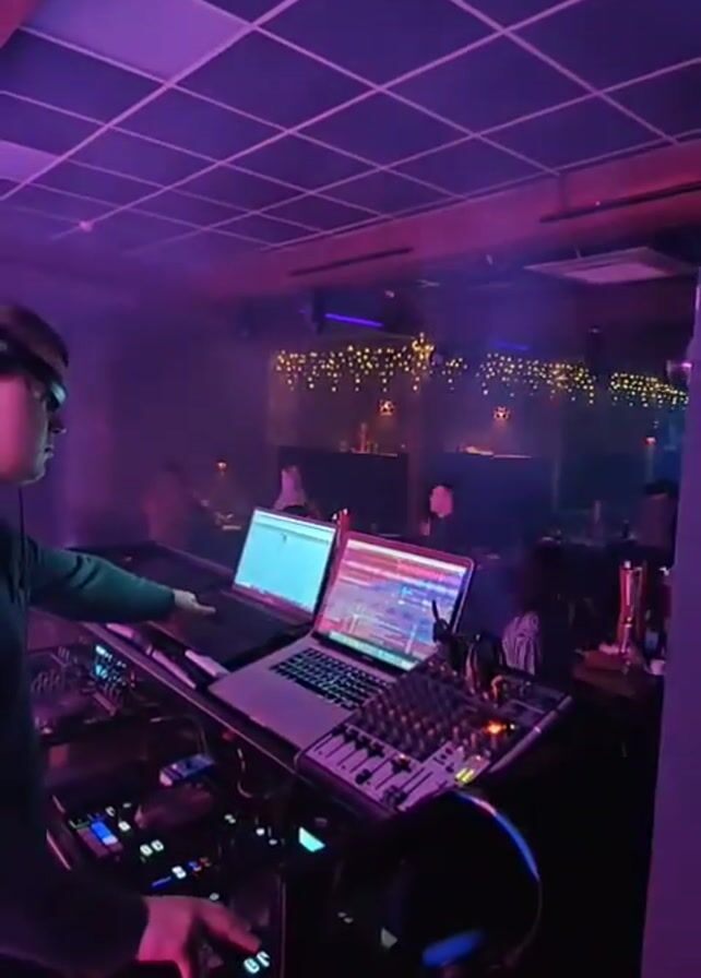 A DJ is working at a club or lounge, using two laptops and a mixer to create music. The club has a dark atmosphere, illuminated by colored lights, and it's filled with smoke. There are patrons seated in the background, enjoying drinks. The DJ is wearing headphones and operating the equipment, seemingly engrossed in their work.