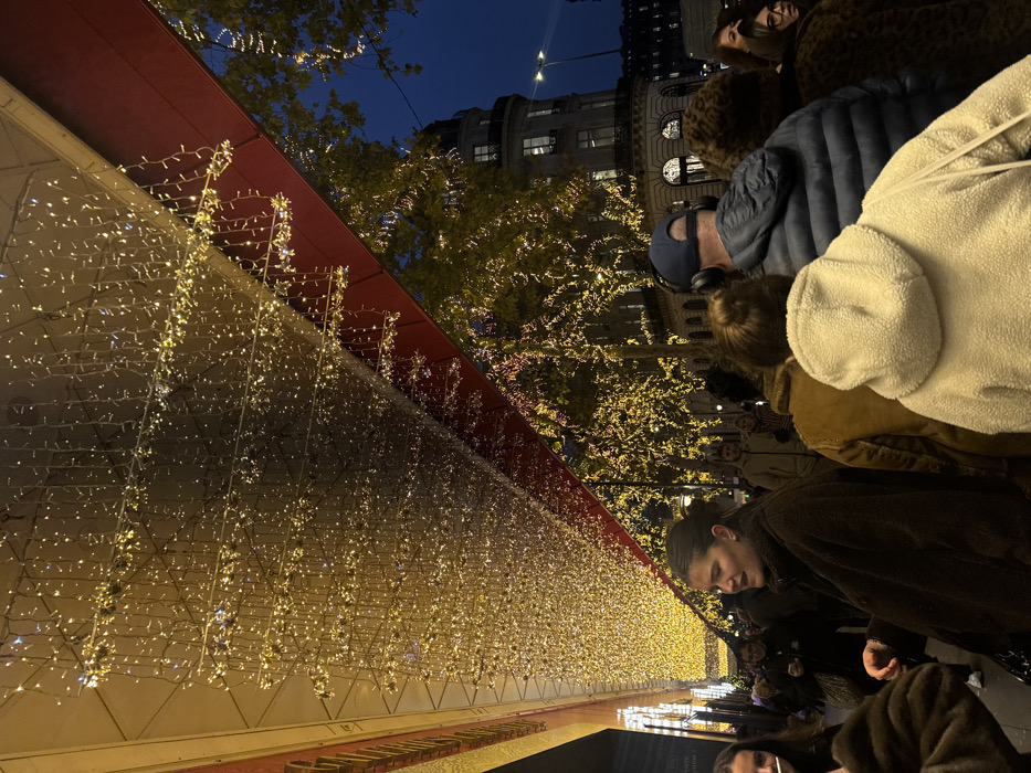 A nighttime scene features a building adorned with a dense curtain of twinkling yellow lights. The building's structure includes a red awning. Pedestrians wearing various coats and jackets are gathered, their faces illuminated by the ambient light. A building with architectural details is visible in the background behind a tree with lights. The overall atmosphere suggests a festive or holiday setting.