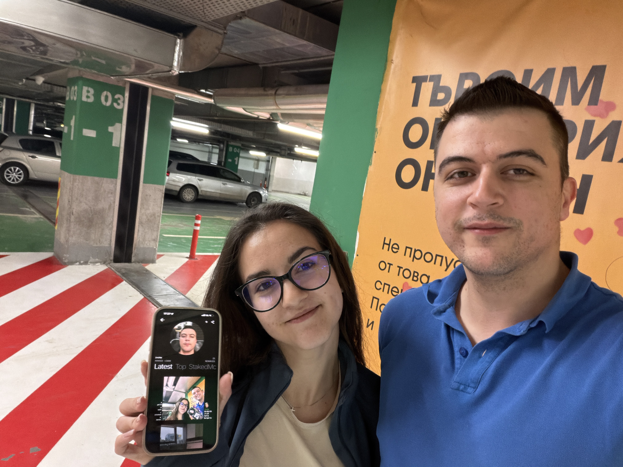 A medium shot captures two individuals in what appears to be a parking garage in Sofia, Bulgaria