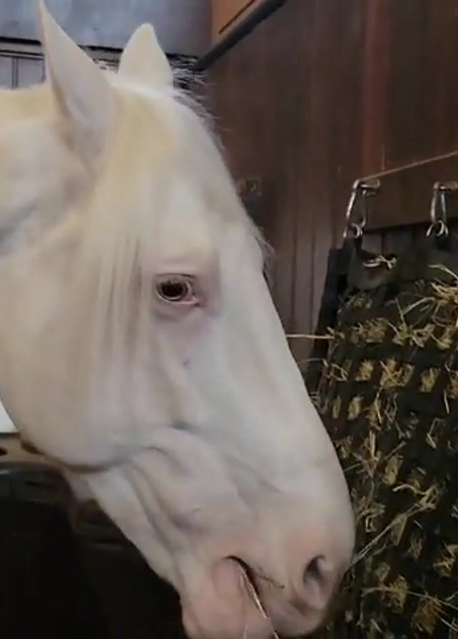 white horse standing in a stable stall, eating hay from a black net feeder