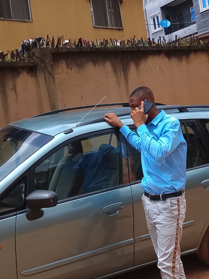 A young adult male, wearing a light blue long-sleeved shirt, light-colored trousers with patterned side stripes, and a black belt, stands alongside a light teal-colored station wagon or small SUV. He is holding a dark-colored smartphone to his right ear with his right hand, engaged in a call, while his left hand rests on the vehicle's black roof rail. The vehicle features a thin antenna extending from the roof near the windshield. The scene is located in the city of Onitsha, Nigeria. In the background, an ochre-yellow building wall dominates the left side of the frame. This wall is topped with embedded shards of broken glass, forming a security barrier, over which various items of clothing are draped. The wall exhibits grime, vertical streaks, and a visible vertical crack. Faint, etched lettering, possibly "PRIVATE", is discernible on the wall's surface. Above this wall, a portion of the building with two dark windows is visible. To the right, behind the man and the vehicle, a multi-story building with a grey facade, a balcony, and a prominent blue satellite dish is present. The environment is brightly lit by daylight, suggesting an urban setting.