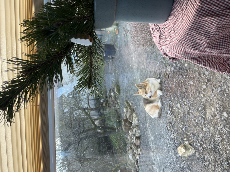 The image displays an outdoor scene in Gangloff, Germany, viewed through a clear window. In the foreground, a red and white checkered tablecloth covers a surface on the bottom right, partially supporting a light grey cylindrical pot. This pot contains dark green pine branches, from which a small white, gingerbread-man-shaped ornament is suspended. Above the window, light brown horizontal blinds are visible. Through the window, a tri-color Pembroke Welsh Corgi dog is positioned in the midground, lying on a gravel-covered area. The dog, with fawn, white, and dark brown markings, rests with its front paws tucked and its head turned to the right. To the left of the dog, a pile of various rocks and stones is present on the gravel. The background consists of numerous deciduous trees with bare branches, indicating a late autumn or winter season. Several dark pots are visible further back among the trees, and a light-colored building is partially discernible through the foliage on the far right. The scene is illuminated by diffused daylight, suggesting an overcast sky.