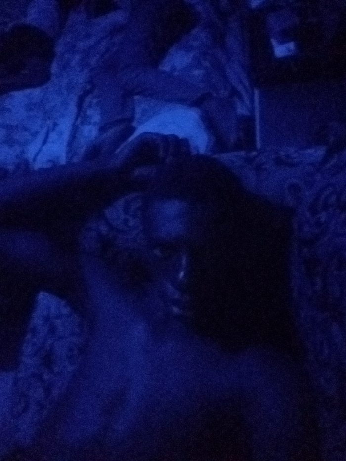 A person lies on a patterned bed in dim, blue-toned lighting. One arm is raised towards their head, possibly touching their hair, while the other arm lies to the side. The person faces the camera. The background is a mix of pillows and bedding. The overall image is low in clarity.