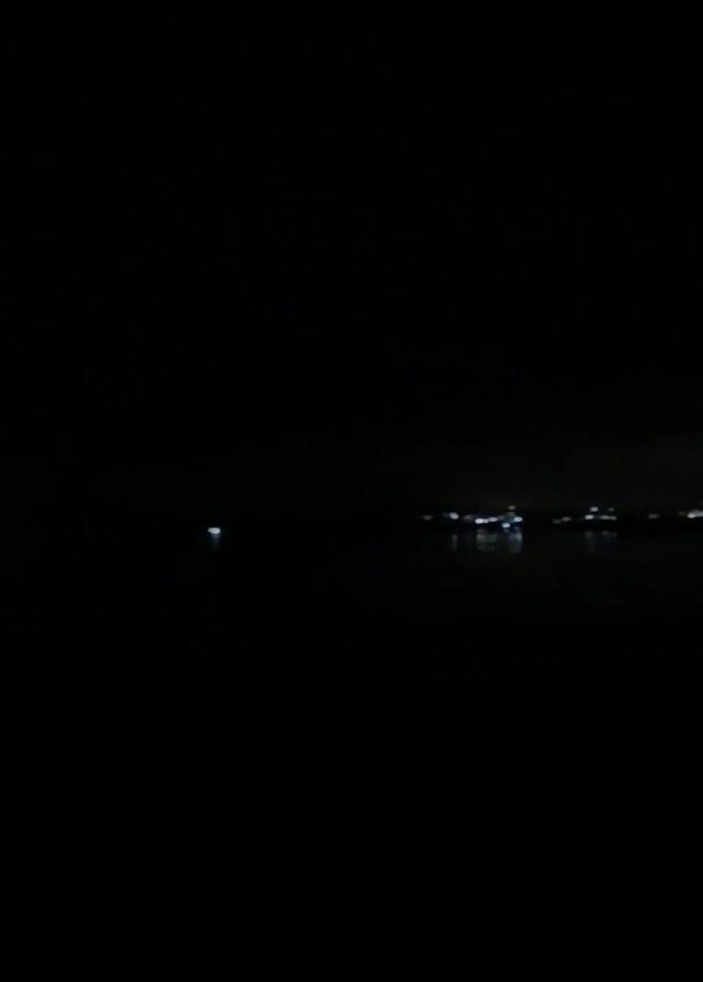 night view of a body of water. In the distance, there are faint lights, likely from a city or town. The sky is dark, and there may be clouds partially obscuring the view. The water appears calm and reflects the distant lights. The overall scene is dark and still.