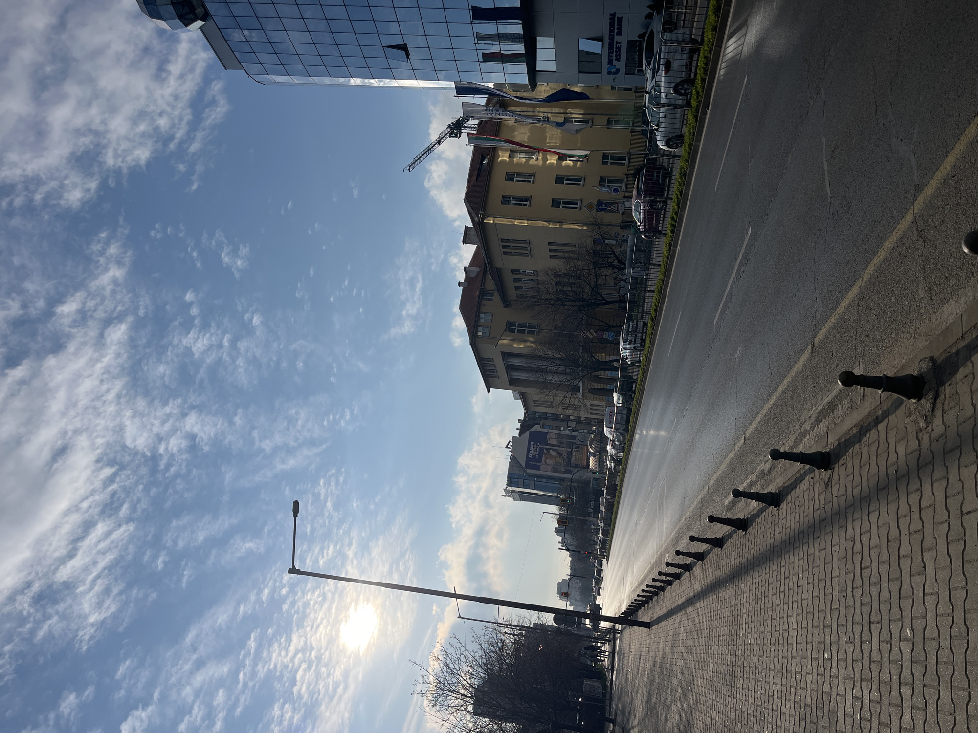 The image depicts a wide urban boulevard in Sofia, Bulgaria, specifically Dragan Tsankov Boulevard, looking southeast from near the International Asset Bank building. The scene is captured during daylight under a partly cloudy sky with scattered cirrus clouds. The sun, positioned low in the upper left, casts long shadows and creates visible lens flare. In the foreground, a gray paved sidewalk composed of interlocking pavers extends from the bottom left. A row of dark, decorative bollards lines the sidewalk's edge, separating it from the street. Long shadows from these bollards and a prominent black streetlamp extend across the sidewalk and onto the road. The midground features a multi-lane asphalt boulevard, appearing somewhat reflective from the low sun and showing surface cracks. Numerous vehicles are parked along both sides of the boulevard, particularly on the right. In the distance, additional vehicles are in motion, and red traffic signals are visible. A line of bare deciduous trees runs along the left side of the boulevard, behind which indistinct pedestrian figures are discernible on a distant sidewalk. On the right side of the frame, a modern multi-story building with a blue-tinted glass facade is prominent. The text "INTERNATIONAL ASSET BANK" is legible on its lower section, and a distinctive geodesic dome structure caps its roof. Several vertical flags, including the Bulgarian national flag (white, green, red), hang from poles in front of this building. To the left of the glass structure, an older, light-yellow building with a reddish-brown tiled roof is visible, along with a green construction crane partially obscured behind it. Farther down the boulevard, additional urban buildings and billboards recede into the distance.