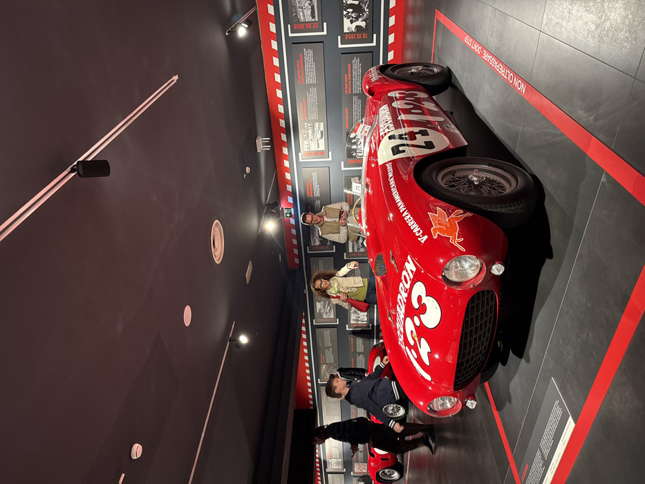 The image depicts an indoor exhibition space, specifically identifiable as a museum located in Maranello, Italy, likely the Ferrari Museum