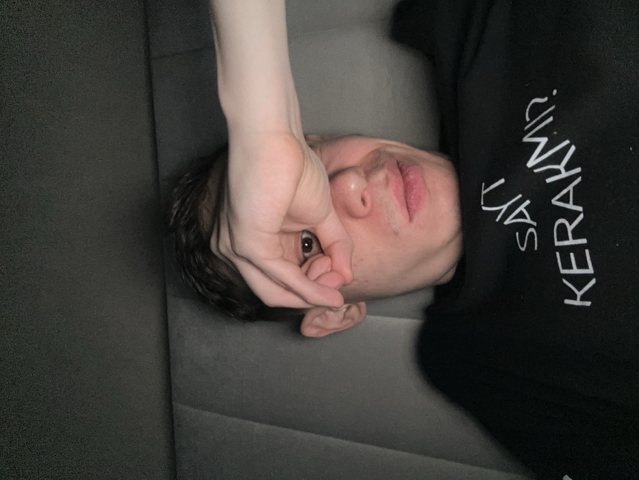 An adult male with short dark hair and a light complexion is depicted in a close-up, low-light setting. He is wearing a dark, possibly black, long-sleeved shirt with white text reading "SAYT KERAKMI?" (Uzbek for "Need a website?") across the chest. His right hand is raised, forming an "okay" gesture with his thumb and index finger circled around his right eye, which is looking directly forward. His lips are slightly pursed, and a faint mustache is visible. The background consists of a dark grey, padded surface, likely upholstery, with vertical seams, suggesting an interior space such as a vehicle cabin or a dimly lit room. The lighting appears to originate from a frontal source, casting mild shadows. The scene is located in the city of Tashkent, Uzbekistan.