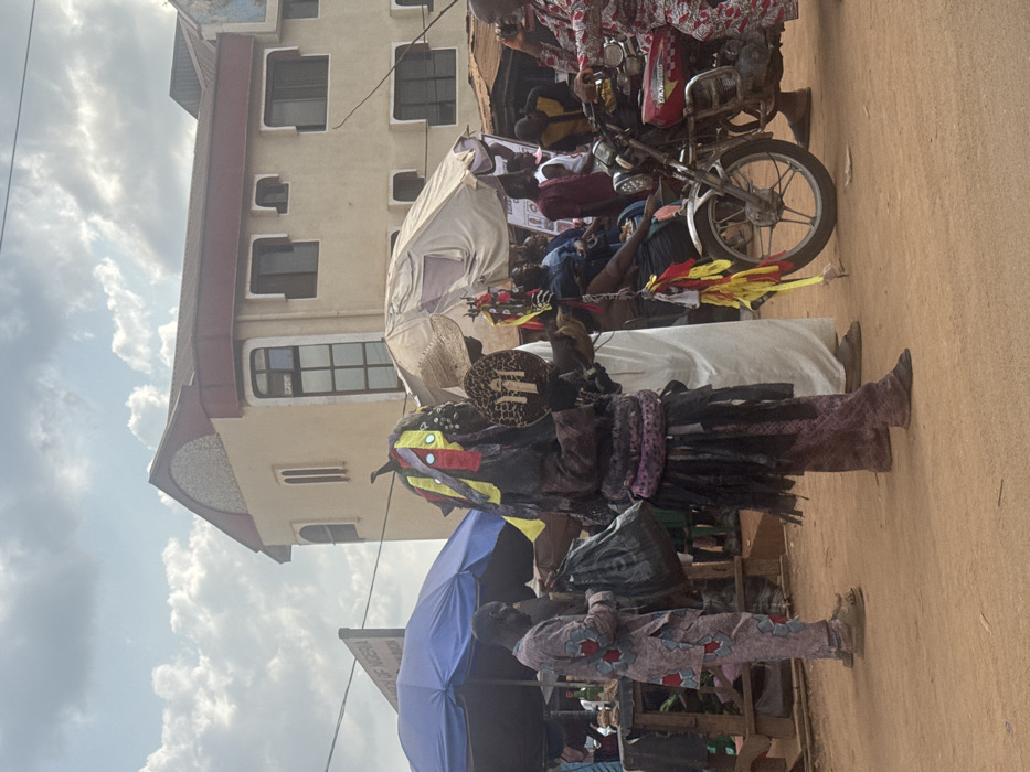 An outdoor scene in Enugwu-Ukwu, Nigeria, depicts a costumed figure amidst a gathering of people and market elements under an overcast sky