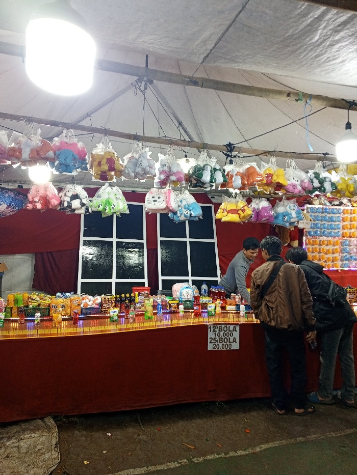 A carnival-style stall beneath a tent awning displays an array of prizes. Plush toys, including colorful characters, hang from the ceiling. The countertop is covered with snacks, beverages, and smaller trinkets. Three men are standing at the stall, seemingly engaged in a game or transaction. A sign advertises "12 Bola 10.000," "25 Bola 20.000," presumably indicating the cost of game balls. The setting appears to be outdoors, with glimpses of a grassy ground visible in the foreground.
