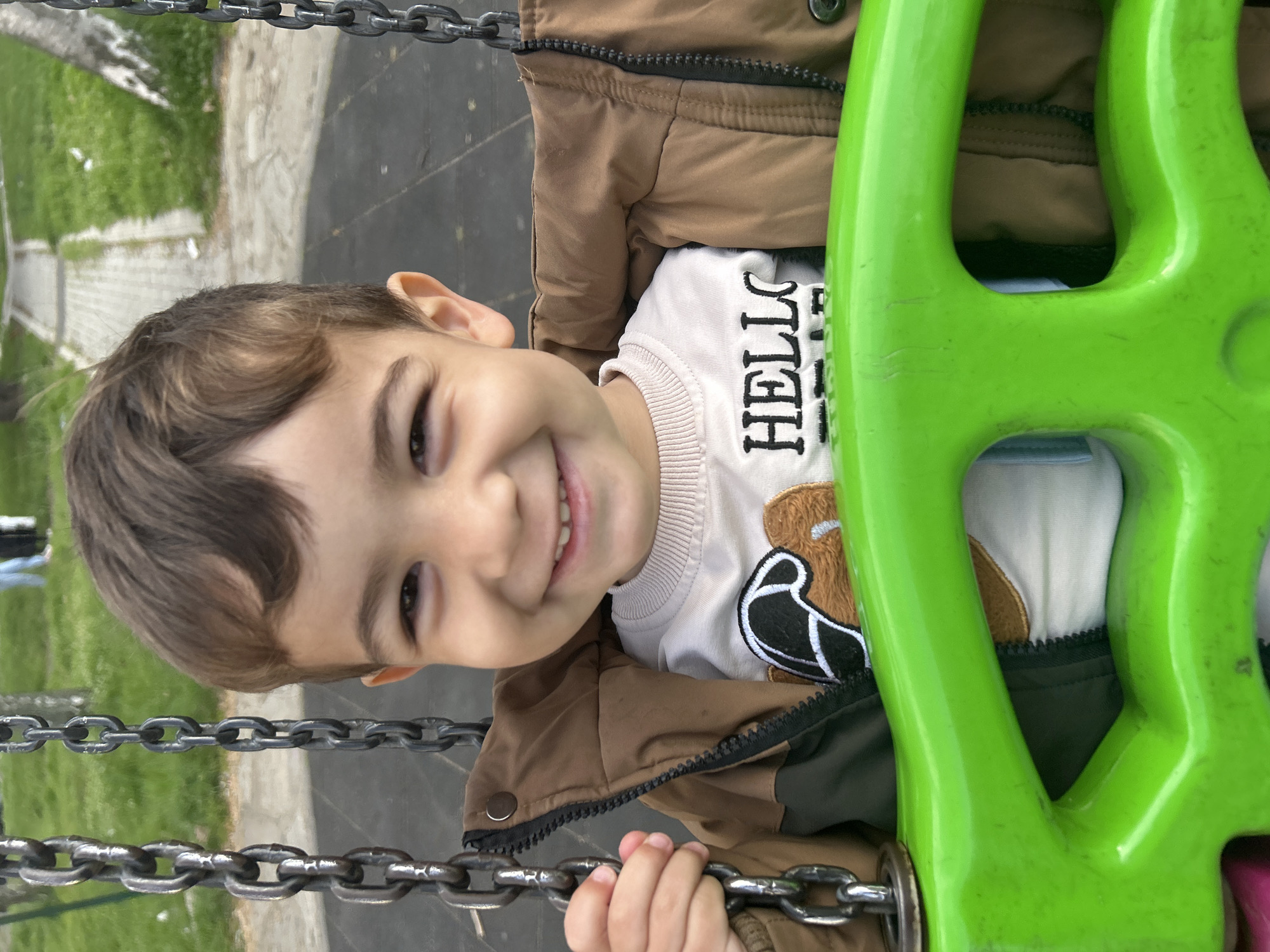 A young child is sitting in a green swing. The child wears a brown jacket over a white shirt with "HELLO" printed on the front. They are holding onto the metal chains of the swing. The background shows a grassy area with trees and a paved walkway, possibly in Kardzhali, Bulgaria.