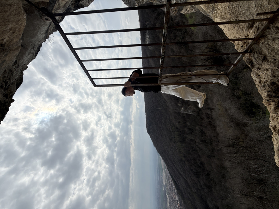 A male subject is observed positioned on a rusted metal gate located at the edge of a rocky cliff or cave entrance within the Shumen Plateau, overlooking the city of Shumen, Bulgaria