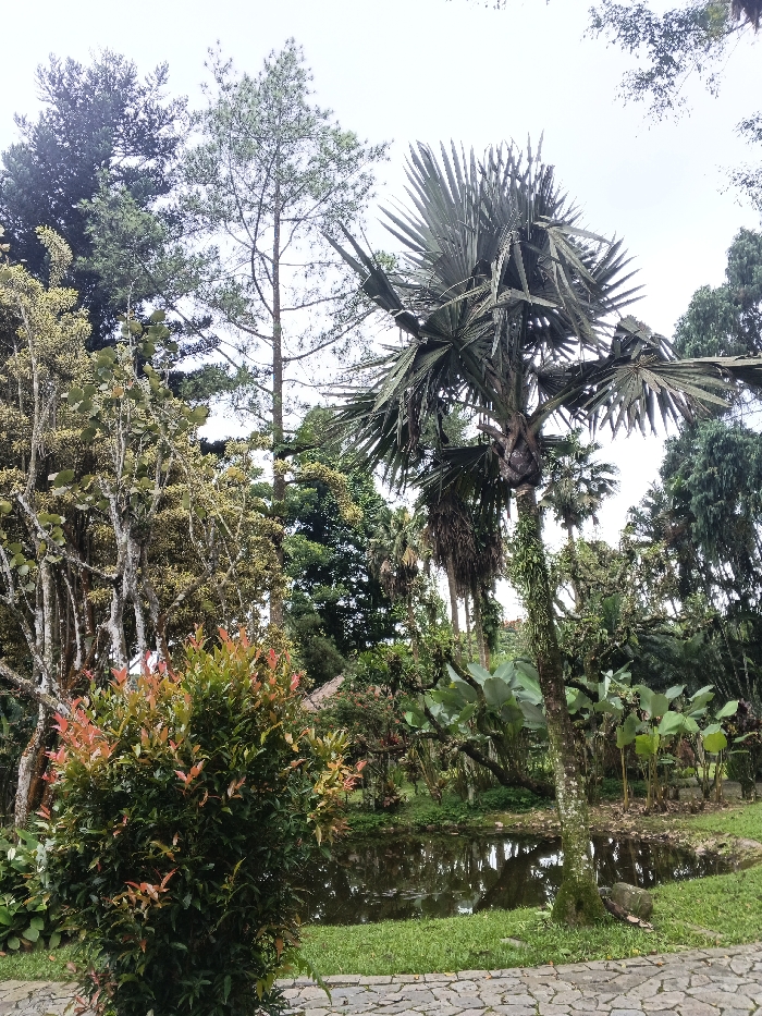 A diverse botanical garden showcases lush foliage. A small pond reflects trees and sky, bordered by verdant grass and a stone path. A vibrant bush with red-tipped leaves stands in the foreground. A mature palm tree with distinctive fan-shaped leaves dominates the scene. Pine and flowering trees add variety to the landscape under an overcast sky.