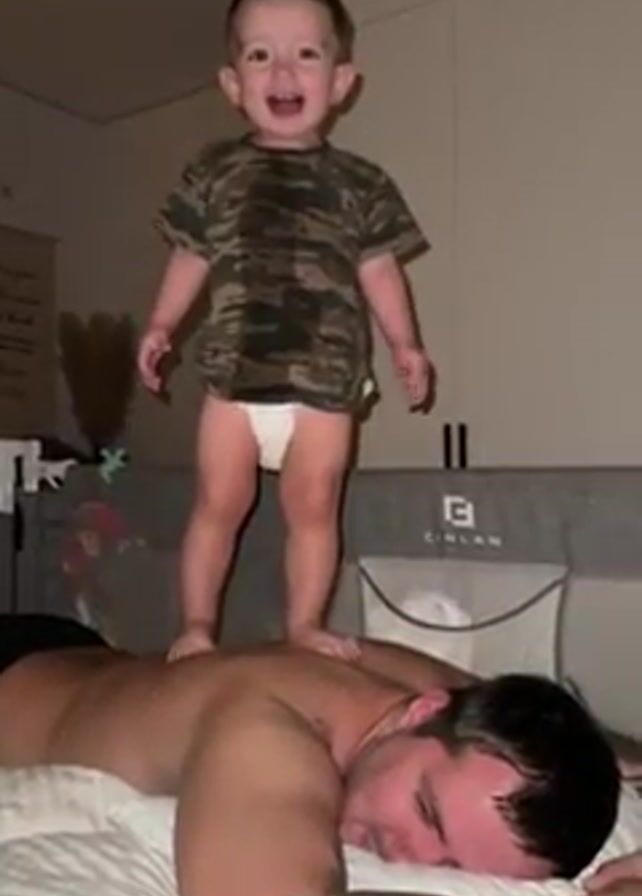A toddler stands on his father's back as he lies on a white bed. The toddler wears a diaper and camouflage shirt. The father is shirtless with a tattoo on his upper arm. The background includes a grey baby crib. The toddler jumps and screams, then grins.