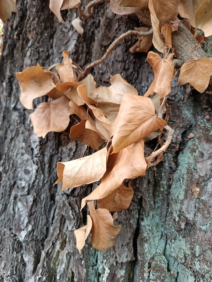 The image displays a detailed close-up of tree bark in Leipzig, Germany. The bark features a rugged, deeply fissured texture, colored predominantly in dark gray and brown. Patches of blue-green discoloration, indicative of algae or lichen, are evident on the bark's surface, notably on the right side. Several clusters of dried, light brown, lobed leaves, consistent with withered ivy foliage, cling to the bark, intertwined with thin, desiccated vine remnants. The leaves appear curled and brittle. No human subjects, animals, or specific actions are depicted within the frame. The scene is illuminated by natural, diffused light.