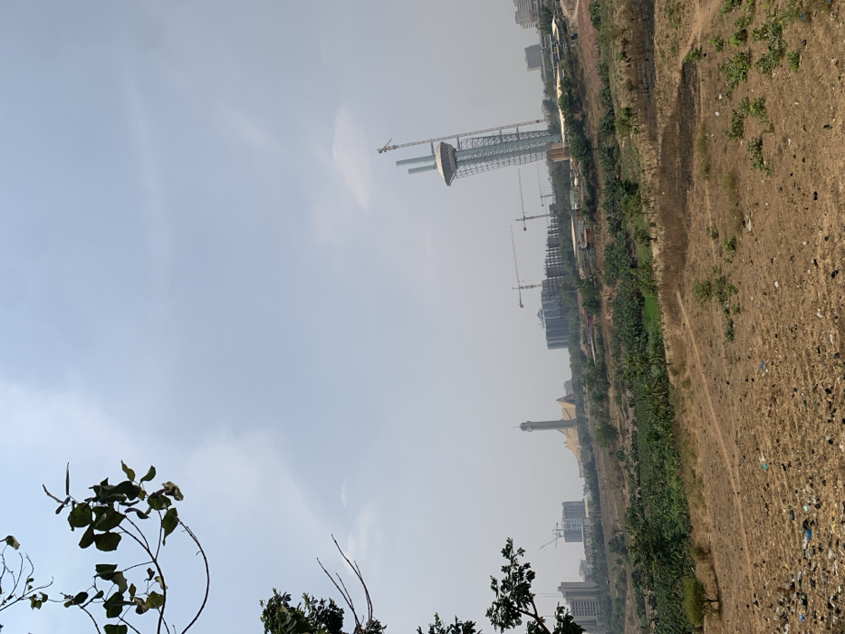 The image presents an elevated, wide-angle view of the Central Business District in Abuja, Nigeria, under a hazy, light blue-grey sky. The foreground consists of dry, reddish-brown earth with sparse, short, dry vegetation. Discarded refuse, including plastic debris, is scattered across the ground, notably in the lower left quadrant. A prominent tree branch with green leaves extends into the upper left portion of the frame. A strip of greener vegetation, possibly cultivated land, runs horizontally across the midground. The background reveals an urban landscape characterized by extensive construction activity. Key landmarks include the National Mosque, visible on the left side of the mid-distance with its golden dome and tall minaret. To the right, the National Christian Centre is identifiable as a tall, modern structure with an open framework, three white cylindrical elements at its apex, and a large construction crane attached to its side. Multiple additional tower cranes are observed across the background, indicating numerous buildings in various stages of construction. No individuals are visible within the frame.
