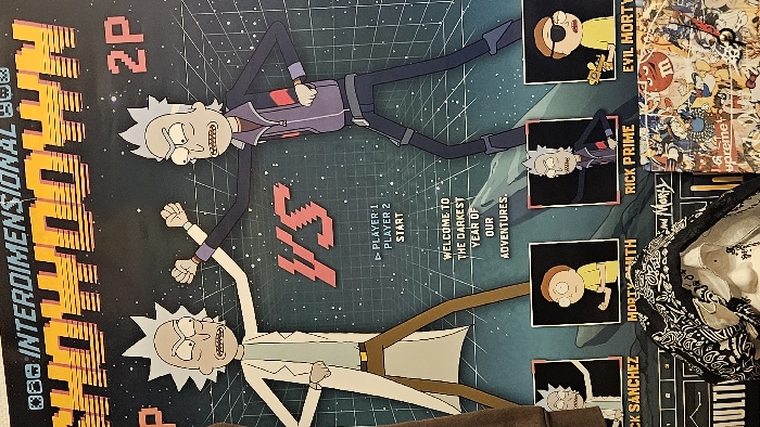 "Rick and Morty" themed video game style poster. It's titled "Interdimensional Showdown 2P". Two Ricks face off with a "VS" in the middle, reminiscent of fighting games. Character boxes are present on the side with labels like "Rick Sanchez," "Morty Smith," "Rick Prime," and "Evil Morty". The background features a starry, grid-like pattern. Text says, "Welcome to the Darkest Year of Our Adventures." The image is taken at an angle, showing the poster is not perfectly flat.