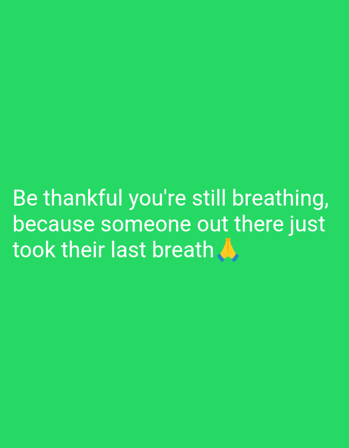 The image displays a solid green background. White sans-serif text is horizontally centered in the lower-middle portion of the frame, reading: "Be thankful you're still breathing, because someone out there just took their last breath". A blue and yellow 🙏 (folded hands) emoji is positioned immediately after the word "breath". No individuals, additional objects, or discernible actions are depicted. The location is in the city of Unknown, Unknown.