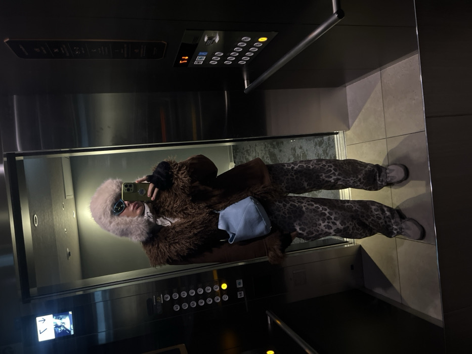 A person takes a mirror selfie in an elevator. They are wearing a furry hat, sunglasses, a fur coat, patterned pants, and grey shoes. They hold a phone in their left hand and wear a black glove on that hand. The elevator control panel shows buttons for multiple floors. The elevator walls are metallic. A small blue bag hangs off their shoulder.