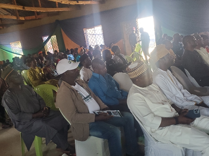 An indoor scene in Barikin Gidar Kanat, Nigeria, depicts a large gathering of individuals, predominantly adult males, seated in rows