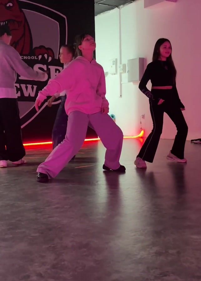 Four young girls are in a dance studio with a red light on the walls, moving in a routine. The girls are wearing street clothes: sweatshirts, leggings, and sneakers. One girl near the center does a brief, high jump in the air and then lands on the ground. The studio has dark floors and one wall features a large image of a dinosaur.