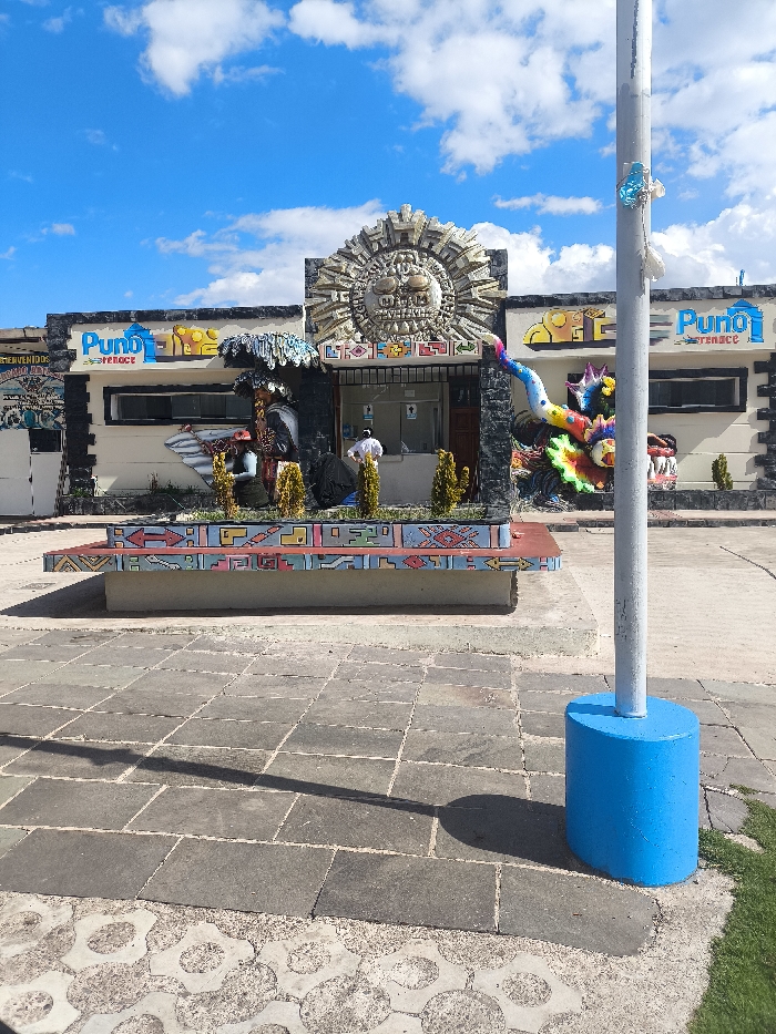 A building with an elaborate facade, featuring a stylized sun emblem above the entrance and colorful mythical creatures flanking the sides. A low, patterned bench sits in front. A blue pole stands prominently in the foreground, casting a shadow on the stone-tiled ground. The sky is partly cloudy. The structure seems to be a tourist spot or a place associated with Peruvian culture.