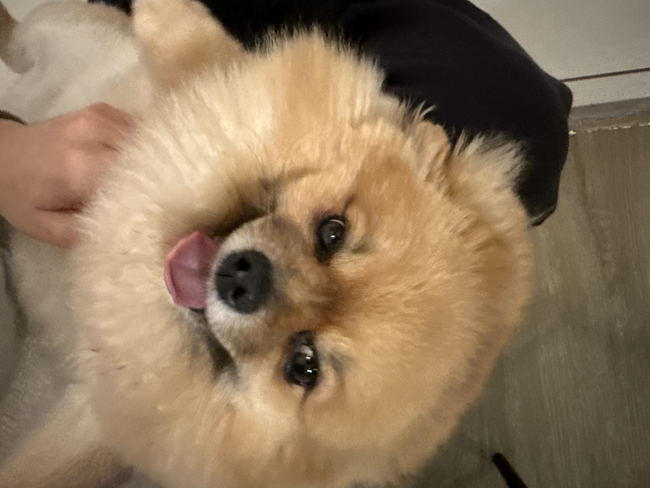 A small, fluffy, tan-colored Pomeranian dog with its tongue sticking out is tilted towards the camera