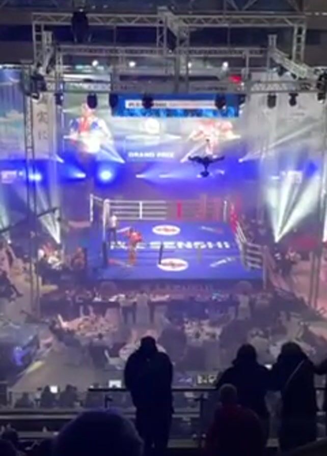 boxing ring in the center of a large arena. The arena is filled with people seated at tables, with additional spectators in the stands around the ring. Spotlights shine on the ring. Two boxers are in the ring, appearing to be preparing for a match or about to begin. There is a large screen above the ring displaying the event details. The overall setting suggests a professional boxing event with a lively atmosphere.