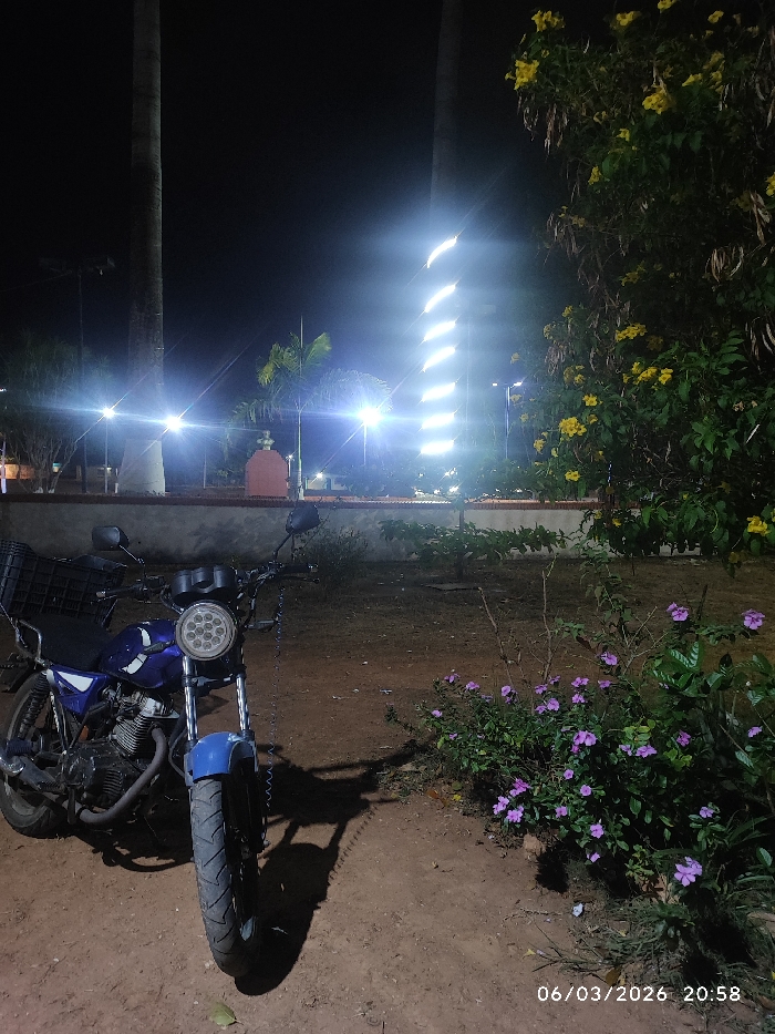This image, captured on March 6, 2026, at 20:58, depicts a nighttime scene within a public park or plaza in Tinaquillo, Venezuela. A blue and black motorcycle is parked on reddish-brown dirt in the immediate foreground, angled slightly to the left. The motorcycle features a circular LED headlight and a black cargo basket on its rear. To its right, a bush with purple flowers and additional green foliage is visible. In the midground, a low concrete wall separates the dirt area from a brightly lit section of the park. Multiple streetlights emit significant lens flare, illuminating the environment. An orange-red concrete structure, possibly a small monument or fountain base, is situated behind the wall. Several tall, slender palm trees are present, with one on the right adorned with a prominent spiral of white lights. A large tree with dark green leaves and yellow flowers occupies the upper right quadrant of the image. The background is dark, consistent with a nighttime setting. No individuals, specific actions, or interactions are discernible.