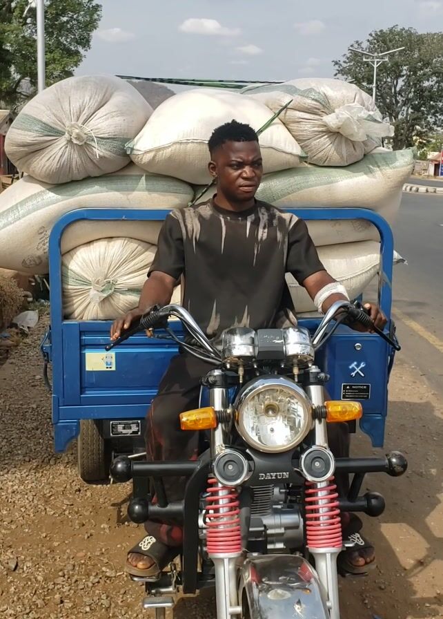 - "A man sits on a blue three-wheeled motorcycle loaded with large white sacks" by FM-Da03f1, licensed under CC BY 4.0