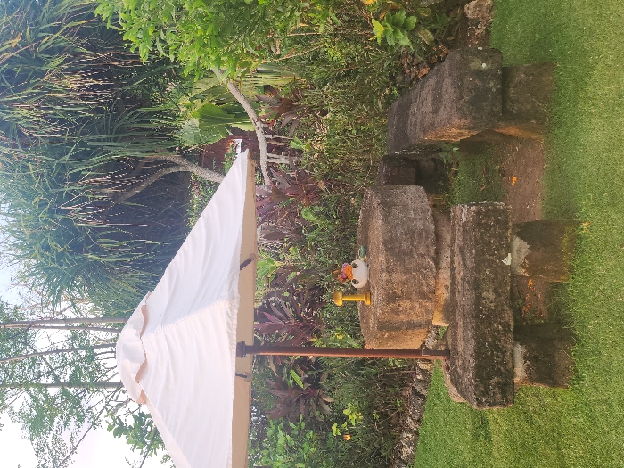 The scene depicts an outdoor seating area within a tropical garden in Pecatu, Indonesia