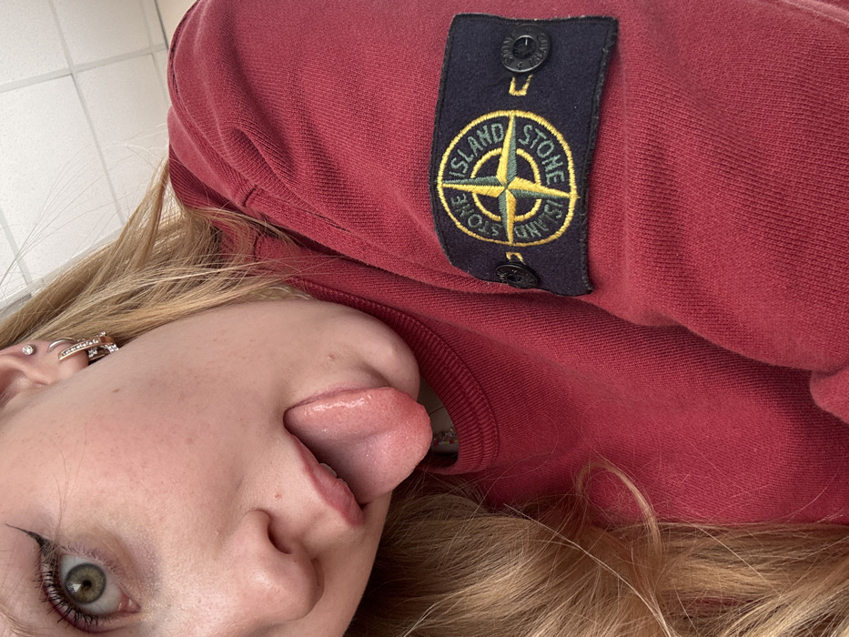 The image presents a close-up, angled portrait of a young female individual indoors. The subject has long, wavy blonde hair partially visible on the left and right sides of the frame. Her left eye (viewer's left) is prominent, featuring a green iris, dark extended eyeliner, and visible eyelashes. Her mouth is open, with her tongue fully extended and directed towards the camera. The right ear (viewer's right) displays two piercings: a silver stud in the upper cartilage and a decorative hoop earring with small stones in the lobe. She is wearing a reddish-maroon long-sleeved crew-neck sweater. On the upper left sleeve (viewer's left), a dark blue rectangular patch with a yellow and green compass rose logo, identified as the Stone Island brand badge, is affixed with two black buttons. The background consists of a white ceiling with visible rectangular tiles and a segment of a fluorescent light fixture, indicating an interior setting. The specific location within Saint Petersburg, Russia, is not determinable from the visual information present in the image.