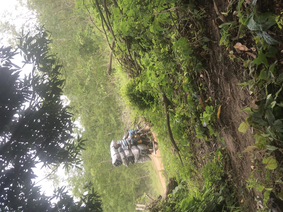 A man is seen riding a bicycle loaded with multiple large sacks. He travels down a dirt road lined with dense green vegetation. The road is flanked by lush trees and undergrowth, creating a tunnel-like effect. Overhanging branches and a cloudy sky suggest a humid, tropical environment. The bicycle struggles under the weight, navigating the narrow path.