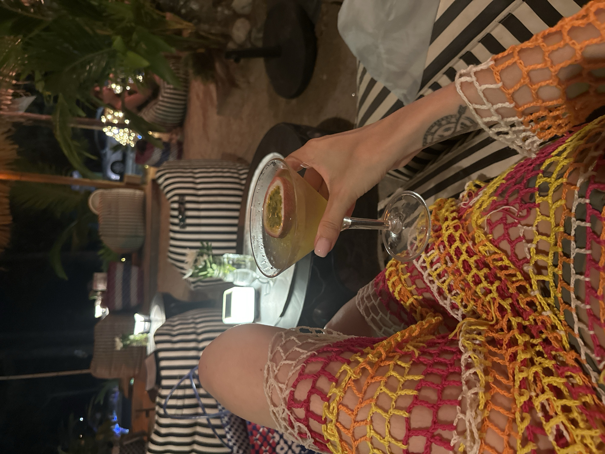 Here is a description of the image: A medium shot shows a person seated at an outdoor bar in Sakhu, Thailand. They are holding a cocktail with a passionfruit garnish. The person has a fair complexion and wears a vibrant, multi-colored crocheted top. The sleeve of the top is visible, made of orange, white, and pink yarn in a net-like pattern. A tattoo is visible on the person's forearm. The setting includes a black round table holding the cocktail glass, and the bar area is decorated with striped cushions and wicker baskets, with outdoor lighting. A palm tree is also in the background.