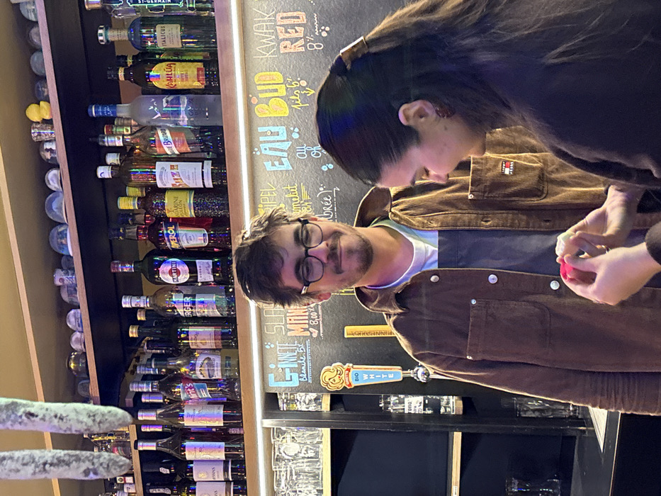 The scene depicts an interior view of a bar in Poitiers, France. In the center, a male individual, appearing to be a bartender, stands behind a dark bar counter. He has short dark hair, wears dark-rimmed glasses, and has a short beard. His attire consists of a light-colored t-shirt layered under a brown corduroy button-up shirt and a dark apron. He is looking downwards and to his right, displaying a slight, pleasant smile. To the right, partially in the foreground, a female individual is visible from the shoulders up. She has dark hair tied back in a ponytail, secured by a rectangular golden hair clip. She wears a dark top and looks down at her hands, where she holds and manipulates a small, multi-colored object, predominantly red and white. A ring is visible on her left index finger. She also displays a slight smile. The background features two wooden shelves filled with various liquor bottles, including brands such as Martini, Aperol, Mandarine Napoléon, Suze, Berger, Kahlúa, and Italicus, along with several wine bottles. Small glasses and decorative items are also present on the top shelf. Below the shelves, a dark chalkboard menu is visible, displaying items and prices written in colored chalk, such as "GINETTE Blonde 5°," "SLAP MANDARINE 8,00€," "EAU BUD," and "KWAK RED 8°." To the left of the male, two beer taps are present, one with a white handle labeled "GINETTE BIO WHITE." A rack of clean glasses is visible further left behind the counter. Two elongated, light-colored objects, resembling cured sausages, hang from the ceiling in the upper left portion of the image. The lighting is artificial and bright, consistent with an indoor bar setting. The interaction between the two individuals appears casual and friendly.