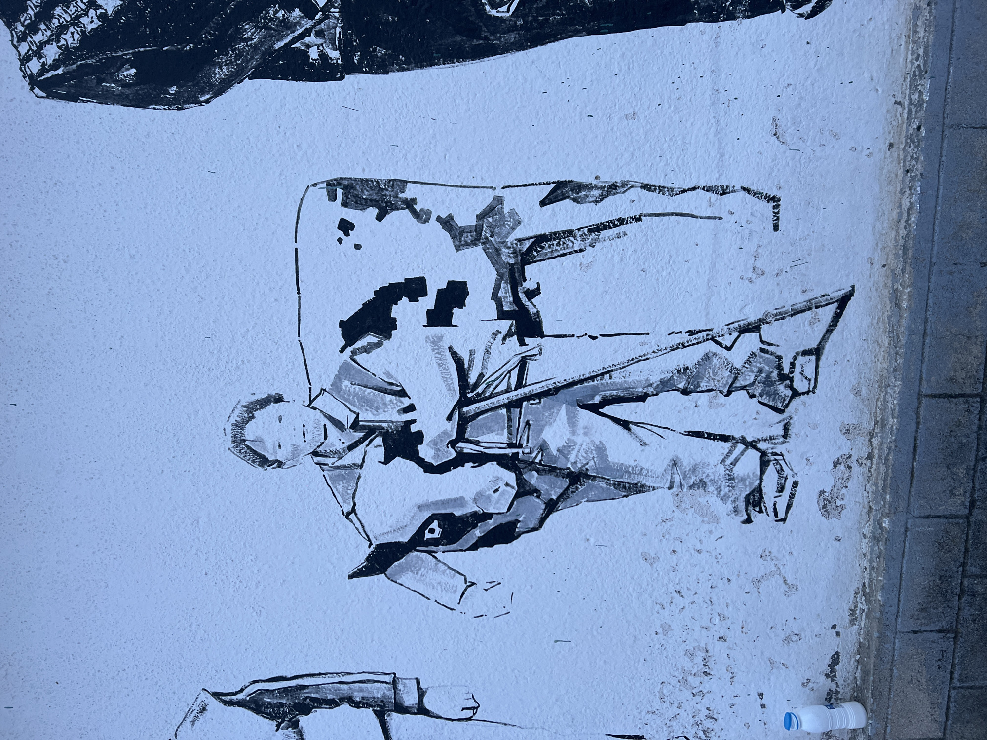 black and white mural on a wall in Staro Zhelezare, Bulgaria. The mural depicts a person in a seated position with a long, thin object (possibly a rifle or staff) resting across their lap. The person is wearing what appears to be traditional or military attire. The mural is incomplete or stylized with fragmented lines and shading. Fragments of other murals are also visible on the wall above and below this mural. To the right of the mural is a concrete surface, and a small white plastic bottle with a blue cap rests on the ground next to the wall. The wall itself appears textured.