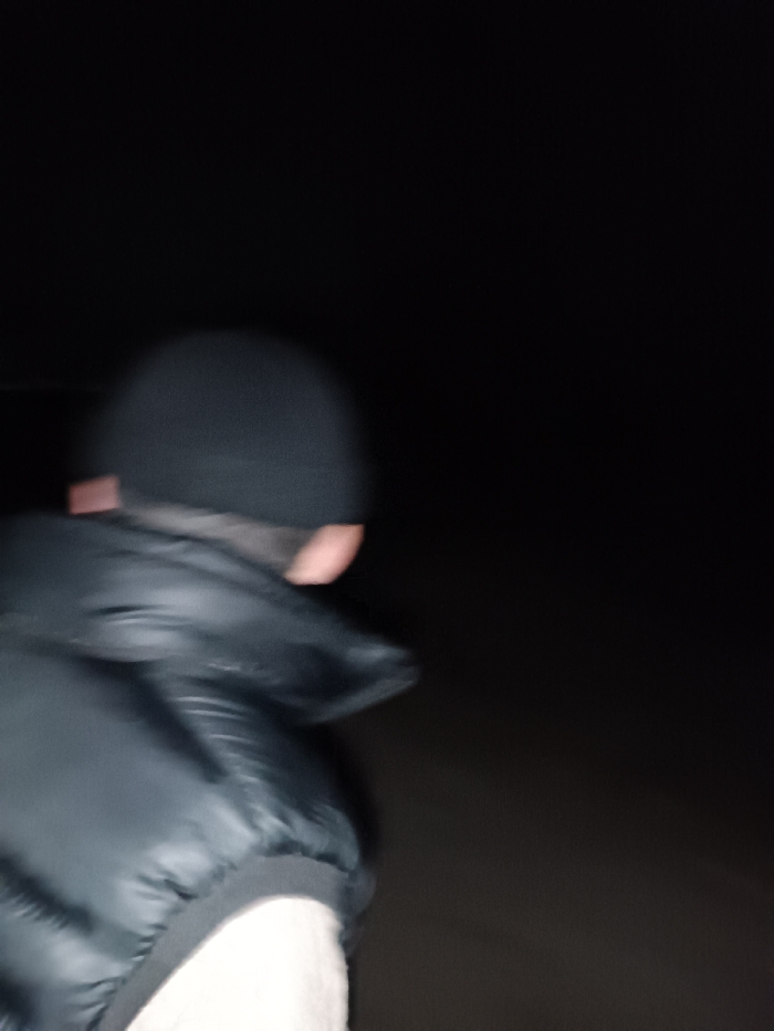 The image displays a single individual within a profoundly dark, low-light environment in Shamsikul, Uzbekistan. The subject is positioned with their back and right profile towards the viewer, exhibiting significant motion blur consistent with movement. They are attired in a dark beanie, a dark, likely black, quilted vest, and a lighter-toned garment visible beneath the vest. Only an indistinct outline of the right side of the head and a partial, light-skinned cheek area are discernible. The background is featureless and appears entirely black, with subtle, dark, indistinct ground visible beneath the subject. A faint, small, reddish-orange rectangular object or artifact is barely perceptible in the lower-left background. No other individuals, objects, or specific interactions are evident within the frame.