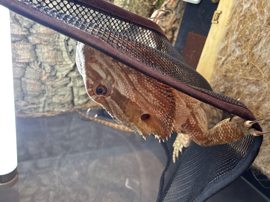 - "An orange and reddish-brown bearded dragon with textured scales, prominent spikes on its chin, and a visible right eye, rests within an enclosure in Yakhroma, Russia" by FM-GnXsE3, licensed under CC BY 4.0
