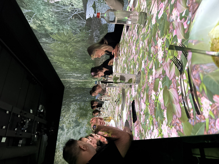The image depicts an immersive dining experience at Dinner in Motion, located at Lichttoren 10, 5611 BJ Eindhoven, Netherlands. Approximately ten to twelve adults are seated along a long, rectangular table within a darkened room. The walls are illuminated by a projected image of a lush green forest, featuring dense foliage, slender tree trunks resembling bamboo, and a stream or waterfall visible on the right side. The table surface also serves as a projection screen, displaying a vibrant pattern of pink and white flowers with green leaves. Essential details include: * **People:** Individuals are primarily visible from the chest up, engaged in dining or conversation. In the foreground left, a man with a beard and dark shirt is seen, wearing a prominent gold watch on his left wrist, looking down at the table. Further down the table on the right, a blonde woman smiles while holding cutlery. Another woman further left has streaks of purple in her hair. * **Objects:** The table is set with white plates, forks, and knives. Various drinks are present, including tall textured glasses containing ice and mint, and clear glass bottles of water, one with a red cap. A black smartphone rests face down on the projected tabletop near the foreground. A partially consumed dish with yellow-green contents is visible on a white plate in the immediate foreground. * **Environment:** The ceiling is dark, revealing mounted projectors and utility fixtures. The overall lighting is provided by the projections, creating a focused and dynamic atmosphere. * **Actions/Interactions:** Individuals are observed eating, drinking, and engaging with their companions and the projected environment.