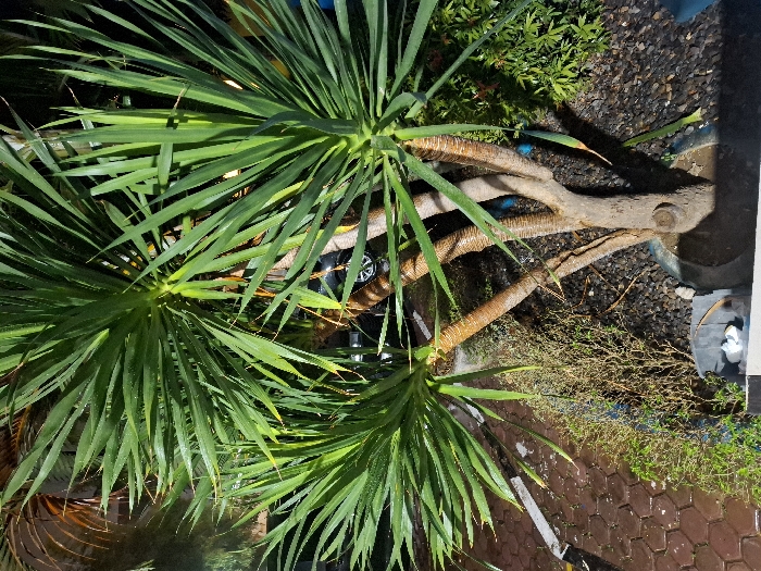 The image depicts an outdoor night scene in Lhokseumawe, Indonesia, focusing on a multi-stemmed Dracaena plant. The plant displays at least three prominent, light brown, textured trunks, each terminating in a dense rosette of long, pointed, dark green leaves. A blue band or tie is visible wrapped around one of the central trunks. The plant is situated in a landscaped area with its base surrounded by dark, small-aggregate gravel, and partially contained within a dark, possibly blue-rimmed, planter. To the left, a section of reddish-brown hexagonal pavers, appearing wet or damp, extends from the foreground, bordered by a white linear marking. A strip of mixed, drier vegetation lies between the paved area and the gravel. In the background, partially obscured by the plant's foliage, a dark-colored vehicle, likely a car, is discernible, with a silver-colored wheel rim clearly visible. A small, crumpled white object rests within a dark container or depression near the plant's base on the left side. The scene is illuminated by artificial light sources, producing visible shadows. No individuals are present.