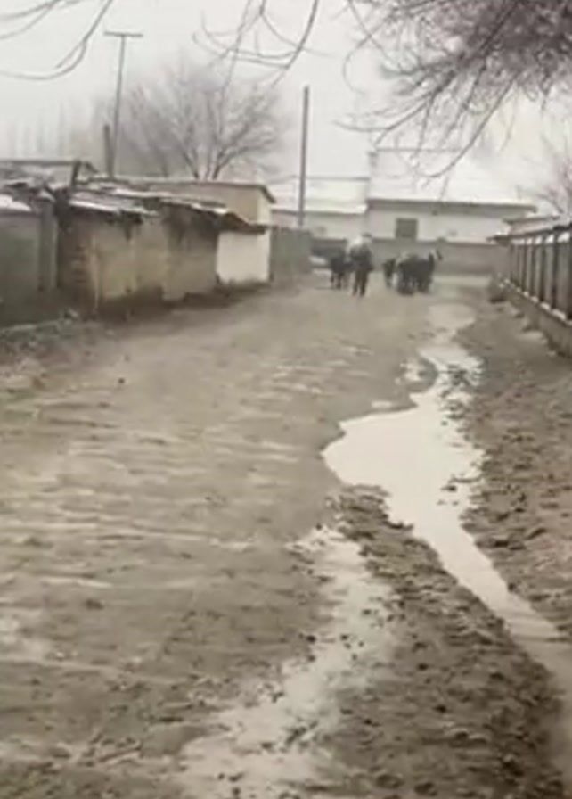 A rural scene unfolds in light snowfall. A man with an umbrella is walking away from the camera, leading a small herd of cattle down a muddy path. The path is bordered by buildings on the left and a fence on the right. The ground is covered in puddles and mud. Trees are bare of leaves, suggesting winter. The overall atmosphere is bleak and cold.
